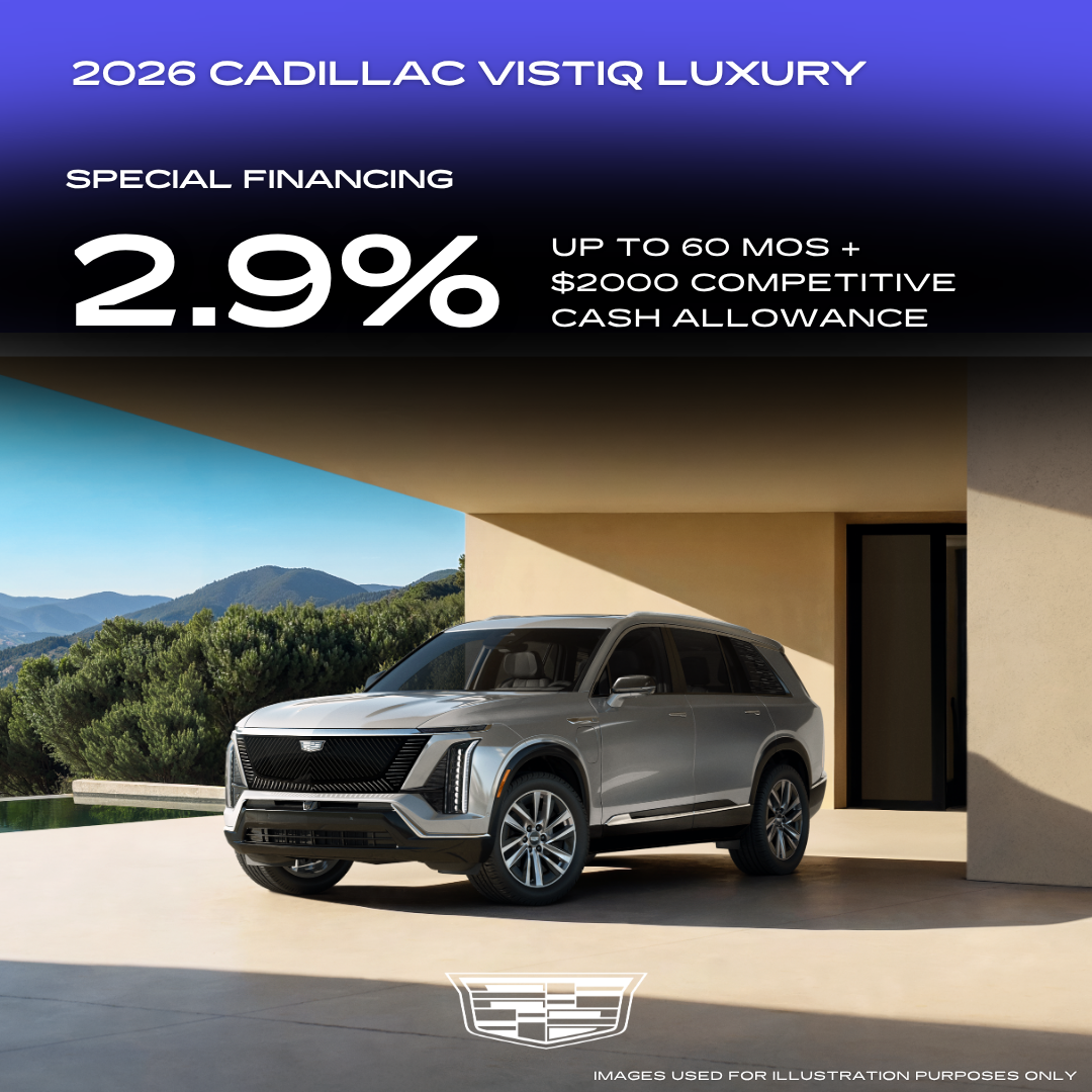 Applies to all New 2026 Cadillac Vistiq in stock. 11.6% example down payment. 2.9% for 60 months financing at $17.92 a month for every $1,000 financed. Prices do not include government fees and taxes, any finance charge, any dealer document processing charge, any electronic filing charge and any emissions testing charge. Must show proof of a current ownership or lease of a 2011 model year or newer select non-GM vehicle at least 30 days prior to the new vehicle sale. Must finance with GMF. Offer Expires 04/30/2026