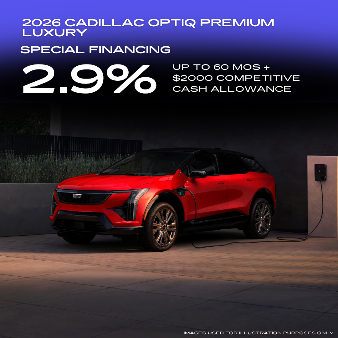 Applies to all New 2026 Cadillac Optiq all in stock excluding V-series. 18% example down payment. 2.9% for 60 months financing at $17.92 a month for every $1,000 financed. Prices do not include government fees and taxes, any finance charge, any dealer document processing charge, any electronic filing charge and any emissions testing charge. Must show proof of a current ownership or lease of a 2012 model year or newer select non-GM vehicle at least 30 days prior to the new vehicle sale. Must finance with GMF. Offer Expires 04/30/2026