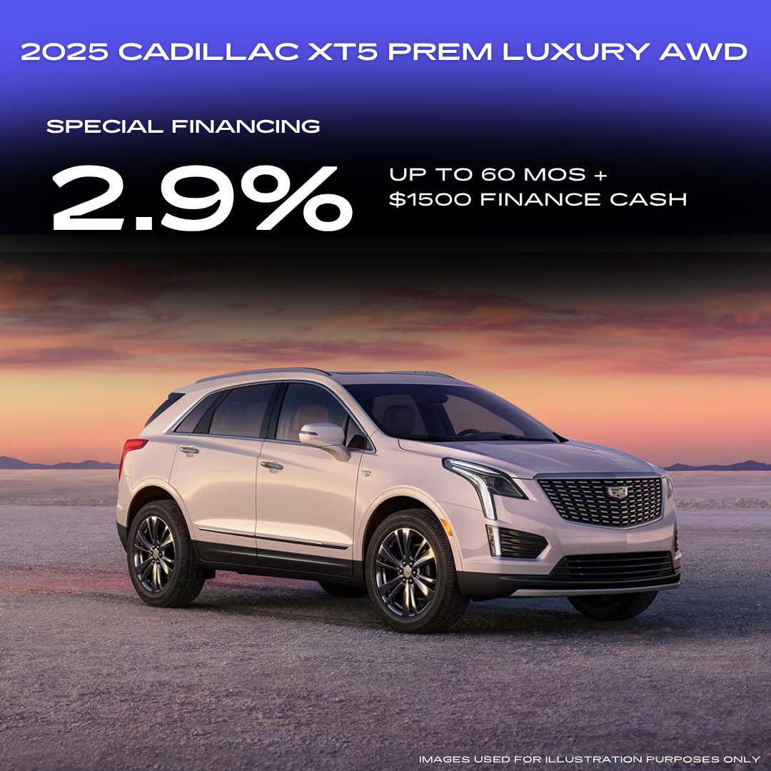 Applies to all New 2025 Cadillac XT5 in stock. 18% example down payment. 2.9% for 60 months financing at $17.92 a month for every $1,000 financed. Prices do not include government fees and taxes, any finance charge, any dealer document processing charge, any electronic filing charge and any emissions testing charge. Must finance with GMF. Offer Expires 04/30/2026