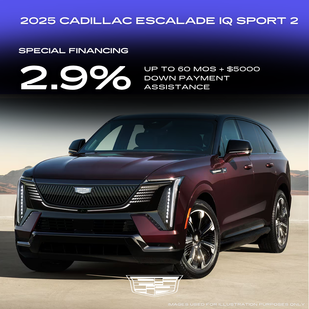 Applies to all New 2025 Cadillac Escalade IQ in stock. 11.6% example down payment. 2.9% for 60 months financing at $17.92 a month for every $1,000 financed. Prices do not include government fees and taxes, any finance charge, any dealer document processing charge, any electronic filing charge and any emissions testing charge. Must finance with GMF. Offer Expires 04/30/2026