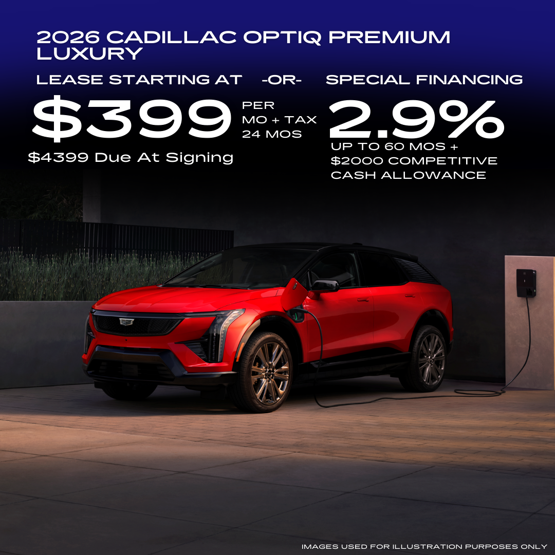 Lease based on 2026 CADILLAC OPTIQ PREMIUM LUXURY (1 at this price) Vin number TS123707. MSRP of $56,019 - $4,399 due at lease signing including $399 first monthly payment, *$2,000 Cadillac EV Conquest Offer (Current owner or lessees of a 2012 or newer Acura, Audi, BMW, Ford, Honda, Hyundai, Infiniti, Jeep, Kia, Lexus, Lincoln, Mercedes-Benz, Toyota,Volvo, Porsche, Tesla, Genesis, Polestar, Rivian), $6,435 capitalized cost reduction, plus taxes, titles, license and documentary service fees. No security deposit required. Option to purchase at lease end $39,773. Lessee is responsible for $.25 per mile over 10,000 miles/year, excess wear, and a $595 disposition fee. Must lease with GMF. Offer Expires 03/31/2026. 1354069 Applies to all New 2026 Cadillac Optiq all in stock excluding V-series. 18% example down payment. 2.9% for 60 months financing at $17.92 a month for every $1,000 financed. Prices do not include government fees and taxes, any finance charge, any dealer document processing charge, any electronic filing charge and any emissions testing charge. Must show proof of a current ownership or lease of a 2012 model year or newer select non-GM vehicle at least 30 days prior to the new vehicle sale. Must finance with GMF. Offer Expires 03/31/2026