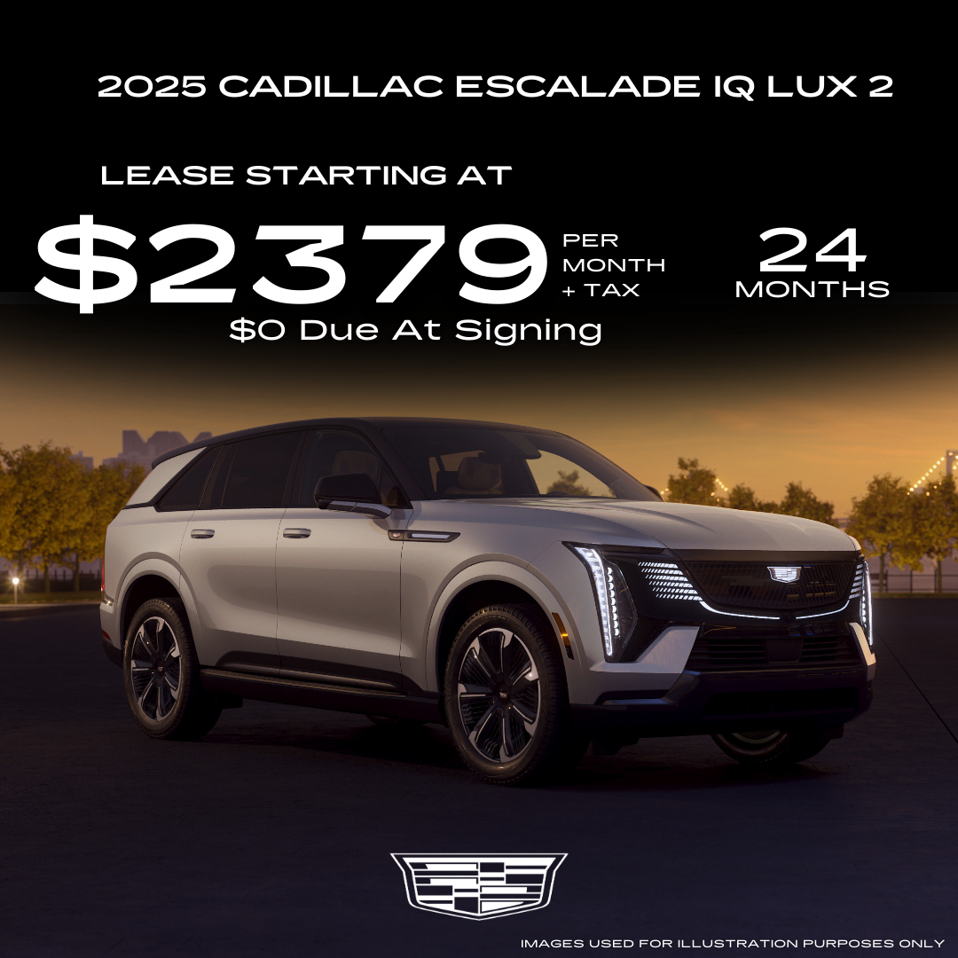 Lease based on 2025 CADILLAC IQ LUXURY 2 (1 at this price) Vin number SU103513. MSRP of $149,990 - $0 due at lease signing including $2,379 first monthly payment, *$5,000 Cadillac Escalade IQ Select VIN CCR, $5,000 capitalized cost reduction, plus taxes, titles, license and documentary service fees. No security deposit required. Option to purchase at lease end $79,494. Lessee is responsible for $.25 per mile over 10,000 miles/year, excess wear, and a $595 disposition fee. Must lease with GMF. Offer Expires 2/02/2026. 1353259