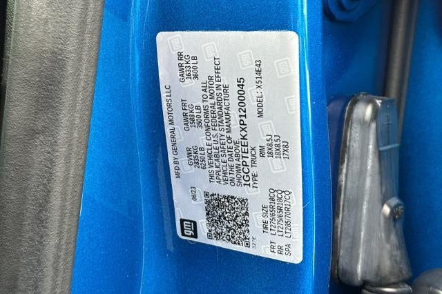 2023 Chevrolet Colorado Trail Boss 4WD Glacier Blue Metallic 2.7L Turbo Colorado Trail Boss, 4D Crew Cab, 2.7L Turbo, 4WD, Glacier Blue Metallic, Jet Black w/Cloth Seat Trim, 1st & 2nd Row All-Weather Floor Liner (LPO), 220 Amp Generator, 3.42 Rear Axle Ratio, 4-Way Manual Passenger Seat Adjuster, 4-Wheel Disc Brakes, 6 Speakers, 6-Speaker Audio System Feature, 6-Way Manual Driver Seat Adjuster, 8-Way Power Driver Seat Adjuster, ABS brakes, Adaptive Cruise Control, Advanced Trailering Package, Air Conditioning, Alloy wheels, AM/FM radio: SiriusXM, Apple CarPlay/Android Auto, Auto High-beam Headlights, Automatic Emergency Braking, Black Nameplates (LPO), Black Painted Mirror Caps, Blind Zone Steering Assist, Brake assist, Chevrolet Performance Black Exhaust Tip (LPO), Chevy Safety Assist, Cloth Seat Trim, Compass, Delay-off headlights, Driver door bin, Driver vanity mirror, Dual front impact airbags, Dual front side impact airbags, Electronic Automatic Cruise Control, Electronic Stability Control, EZ-Lift & Lower Tailgate, Following Distance Indicator, Forward Collision Alert, Front anti-roll bar, Front Bucket Seats, Front Center Armrest, Front License Plate Kit, Front Pedestrian & Bicyclist Braking, Front wheel independent suspension, HD Surround Vision, Heated Power-Adjustable Outside Mirrors, Heavy-Duty Trailering Package, Illuminated entry, Integrated Trailer Brake Controller, IntelliBeam Automatic High Beam On/Off, Lane Keep Assist w/Lane Departure Warning, Low tire pressure warning, Manual Rear-Sliding Window, Navigation System, Occupant sensing airbag, Outside temperature display, Overhead airbag, Overhead console, Panic alarm, Passenger door bin, Passenger vanity mirror, Power door mirrors, Power Driver Lumbar Control Seat Adjuster, Power steering, Power windows, Preferred Equipment Group 0TR, Radio data system, Radio: 11.3" Diagonal Advanced Color LCD Display, Rear Cross Traffic Braking, Rear Park Assist, Rear Pedestrian Alert, Rear reading lights, Rear step bumper, Rear-Window Electric Defogger, Red Recovery Hooks (LPO), Remote keyless entry, Remote Start Kit w/2 Key Fobs (LPO), Safety Package, Security system, SiriusXM Radio, Speed-sensing steering, Split folding rear seat, Steering Wheel Mounted Audio Controls, Steering wheel mounted audio controls, StowFlex Tailgate Storage Compartment, Tachometer, Tailgate Keyed Cylinder Lock, Technology Package, Tilt steering wheel, Traction control, Trail Boss Convenience Package, Trail Boss Convenience Package II, Trailering App, Trip computer, Variably intermittent wipers, Wheels: 18" x 8.5" Black High Gloss Aluminum, Wireless Phone Projection, Colorado Trail Boss, 4D Crew Cab, 2.7L Turbo, 4WD, Glacier Blue Metallic, Jet Black w/Cloth Seat Trim, 1st & 2nd Row All-Weather Floor Liner (LPO), 220 Amp Generator, 3.42 Rear Axle Ratio, 4-Way Manual Passenger Seat Adjuster, 4-Wheel Disc Brakes, 6 Speakers, 6-Speaker Audio System Feature, 6-Way Manual Driver Seat Adjuster, 8-Way Power Driver Seat Adjuster, ABS brakes, Adaptive Cruise Control, Advanced Trailering Package, Air Conditioning, Alloy wheels, AM/FM radio: SiriusXM, Apple CarPlay/Android Auto, Auto High-beam Headlights, Automatic Emergency Braking, Black Nameplates (LPO), Black Painted Mirror Caps, Blind Zone Steering Assist, Brake assist, Chevrolet Performance Black Exhaust Tip (LPO), Chevy Safety Assist, Cloth Seat Trim, Compass, Delay-off headlights, Driver door bin, Driver vanity mirror, Dual front impact airbags, Dual front side impact airbags, Electronic Automatic Cruise Control, Electronic Stability Control, EZ-Lift & Lower Tailgate, Following Distance Indicator, Forward Collision Alert, Front anti-roll bar, Front Bucket Seats, Front Center Armrest, Front License Plate Kit, Front Pedestrian & Bicyclist Braking, Front wheel independent suspension, HD Surround Vision, Heated Power-Adjustable Outside Mirrors, Heavy-Duty Trailering Package, Illuminated entry, Integrated Trailer Brake Controller, IntelliBeam Automatic High