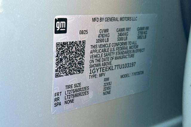 This vehicle is a retired Stevens Creek Cadillac Service Loaner and we know if well. There are many reasons to purchase a retired Service Loaner: 1. Reduced net cost as compared to a new Cadillac. 2. Low Mileage 3. Include the balance of the factory warranty 4. Professionally maintained by factory trained technicians. Prices do not include government fees and taxes, any finance charges, any dealer document processing charge, any electronic filing charge, and any emission testing charge. Escalade IQ Sport, 4D Sport Utility, Electric Motor, AWD, Luna Metallic, Backen Black With Santorini Accents Premium Synthetic, 21 Speakers, 3rd row seats: split-bench, 4-Way Power Driver Lumbar Seat Adjuster, 4-Way Power Front Passenger Lumbar Seat Adjuster, 4-Wheel Disc Brakes, 8-Way Power Driver Seat Adjuster, 8-Way Power Front Passenger Seat Adjuster, ABS brakes, Adaptive suspension, Air Conditioning, AKG Studio 21-Speaker Audio System, Alloy wheels, AM/FM radio: SiriusXM with 360L, Audio memory, Auto High-beam Headlights, Auto-dimming door mirrors, Auto-dimming Rear-View mirror, Auto-leveling suspension, Automatic temperature control, Black Roof, Brake assist, Bumpers: body-color, California Prop 65 Compliant Label Warning, Compass, Console Refrigerator, Contoured Floor Liners, Delay-off headlights, Deleted Mobile Service Plus, Driver door bin, Driver Memory, Driver vanity mirror, Dual front impact airbags, Dual front side impact airbags, Electronic Stability Control, Emergency communication system: OnStar and Cadillac connected services capable, Floor Liner Package, Four wheel independent suspension, Front anti-roll bar, Front Bucket Seats, Front Center Armrest, Front dual zone A/C, Front License Plate Bracket, Front reading lights, Fully automatic headlights, Garage door transmitter, Google Built-in, Heads-Up Display, Heated door mirrors, Heated Driver and Front Passenger Seats, Heated front seats, Heated rear seats, Heated steering wheel, HVAC memory, Illuminated entry, Integrated Cargo Liner, Inteluxe Seat Trim, Knee airbag, Low tire pressure warning, Magnetic Ride Control Suspension, Memory seat, Navigation system: Google Automotive Services Capable, Occupant sensing airbag, Outside temperature display, Overhead airbag, Overhead console, Panic alarm, Passenger door bin, Passenger vanity mirror, Power door mirrors, Power driver seat, Power Liftgate, Power passenger seat, Power steering, Power windows, Preferred Equipment Group 1SF, Radio data system, Radio: Infotainment Experience, Rain sensing wipers, Rear air conditioning, Rear anti-roll bar, Rear dual zone A/C, Rear reading lights, Rear window defroster, Rear window wiper, Reconfigurable Full-Color Head-Up Display, Remote keyless entry, Security system, SiriusXM with 360L Trial Subscription, Speed control, Speed-sensing steering, Split folding rear seat, Spoiler, Steering wheel mounted audio controls, Telescoping steering wheel, Tilt steering wheel, Traction control, Trip computer, Turn signal indicator mirrors, Variably intermittent wipers, Ventilated front seats, Wheels: 22 10-Spoke Alloy with Mask and Polish.